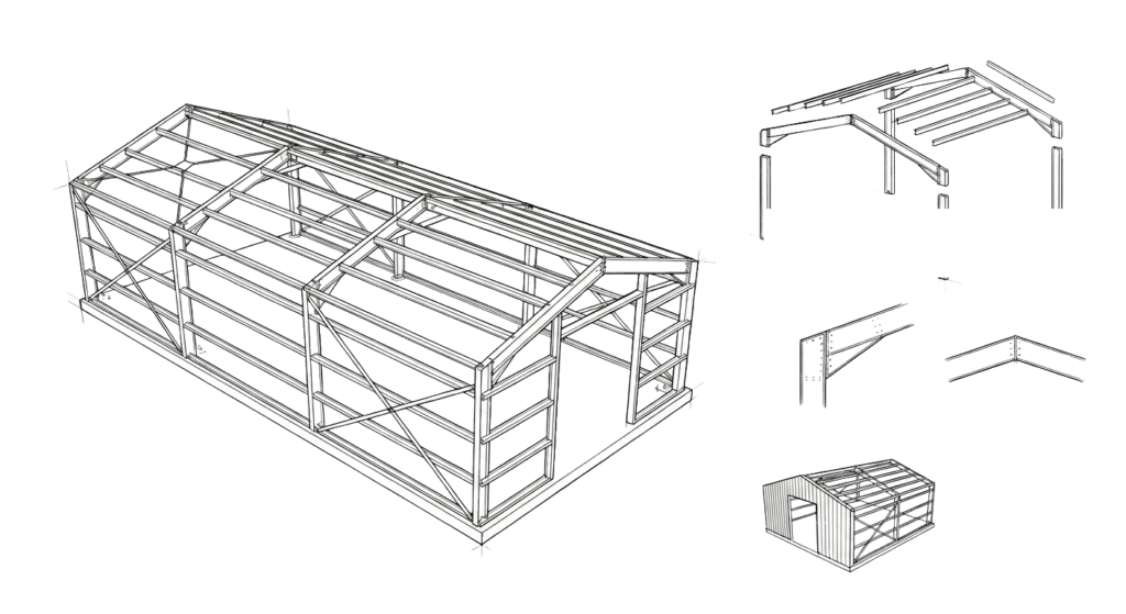 The kit includes the main steel portal frame structure that forms the backbone of the home, providing strength, durability, and a practical base for efficient construction.